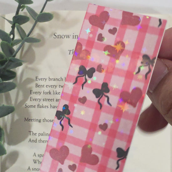 Cute meets practical. This handmade magnetic bookmark uses a pink gingham print sprinkled with hearts and bows, sealed under a sparkle holographic laminate for durability and eye‑catching shine. The internal magnets grip pages firmly, so your spot stays put during reading, note‑taking, or journaling. At roughly 3 × 1.25 inches when folded, it’s slim enough for any paperback, notebook, or planner without adding bulk.
