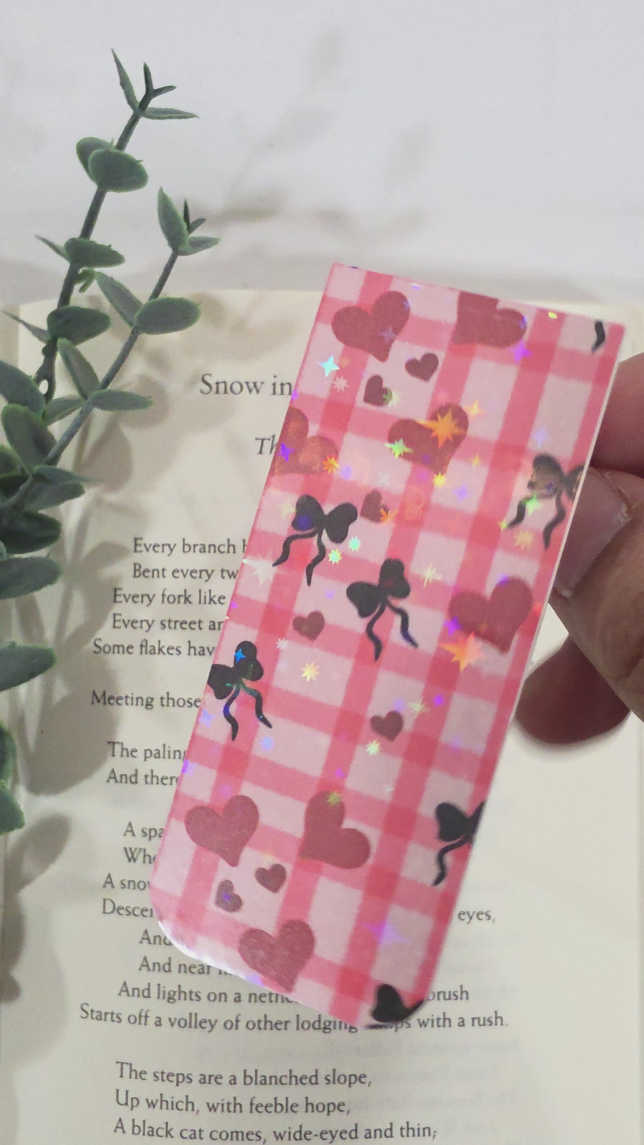 Pink Gingham Hearts & Bows Magnetic Bookmark — Sparkle Holographic