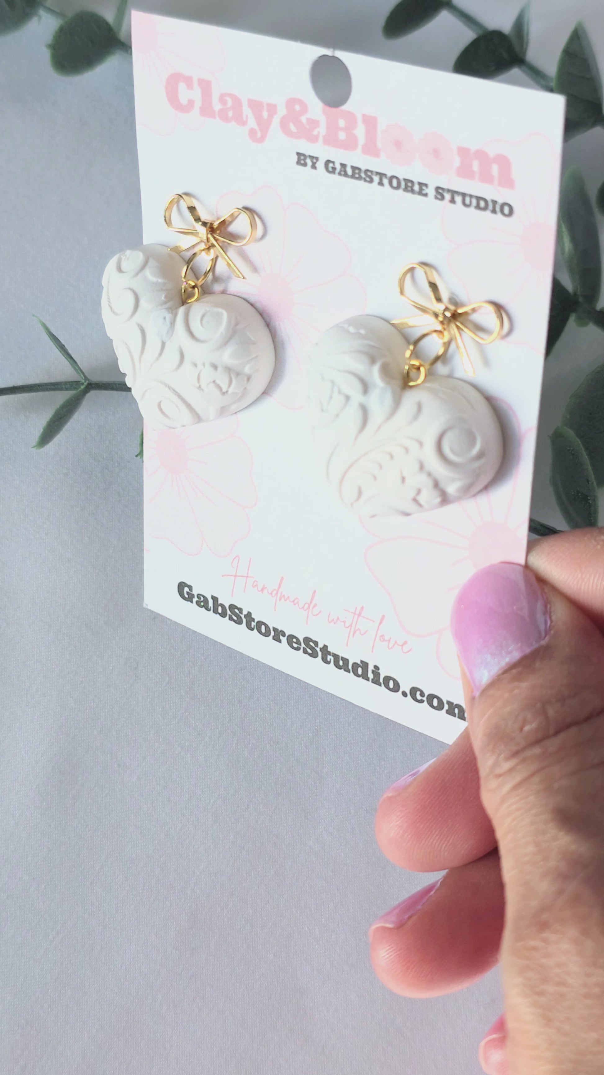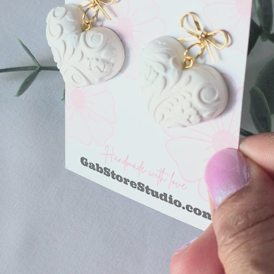 Soft elegance meets handmade detail. These puffy, dimensional heart earrings feature a raised embossed pattern that adds texture, depth, and a subtle vintage feel. Their off-white tone keeps them timeless and versatile, while the delicate gold bow adds a refined, feminine finish.