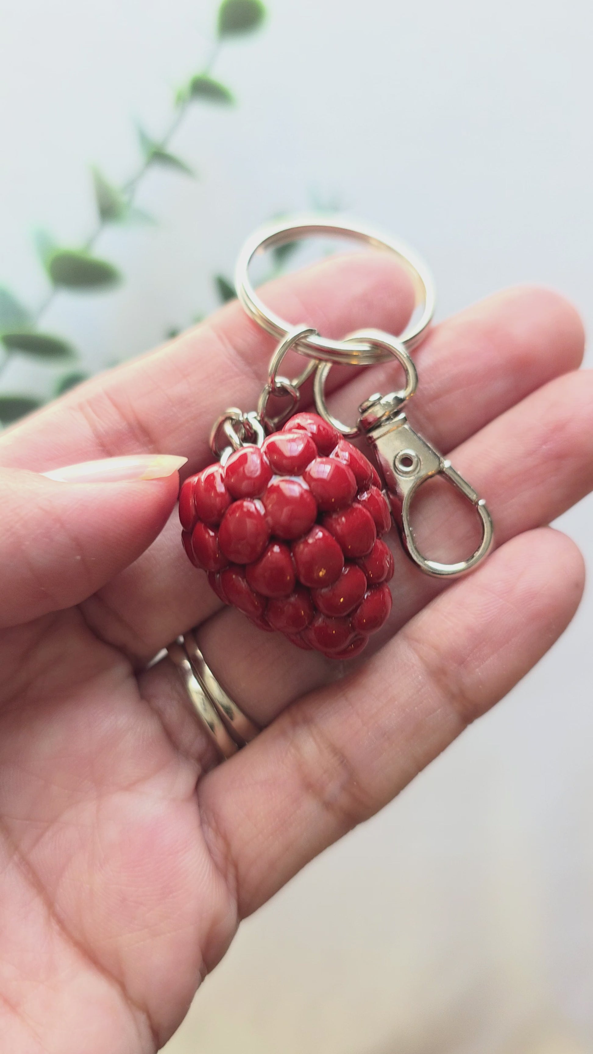 This keychain is giving farmers market meets statement accessory. A hand-sculpted red raspberry made from polymer clay, sealed with UV resin for durability and shine. Lightweight, playful, and impossible to ignore.