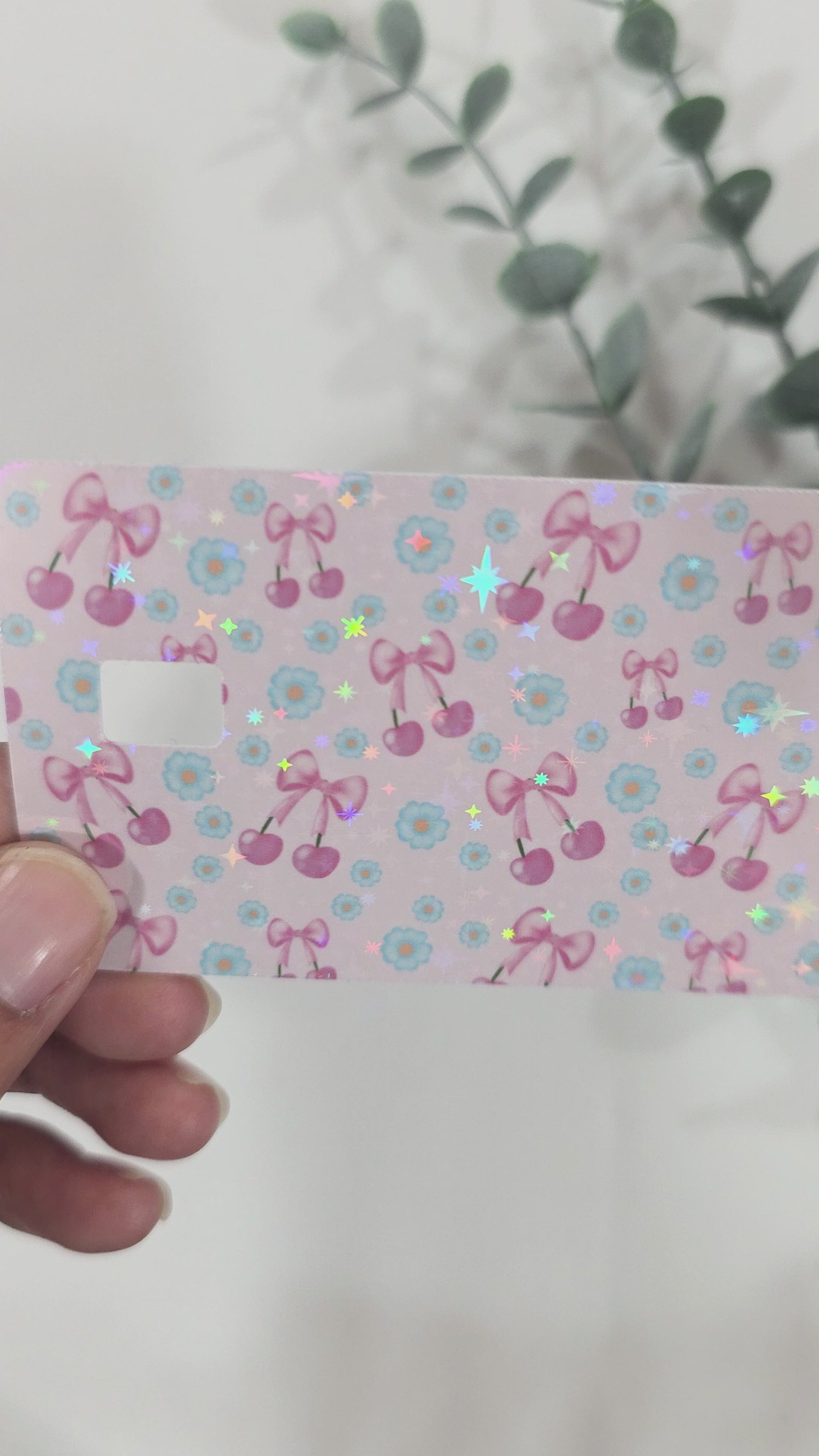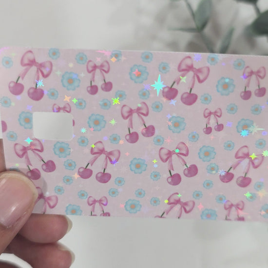 The cutest cherries with bows on a light pink background. This sparkle holographic credit card skin is perfect!