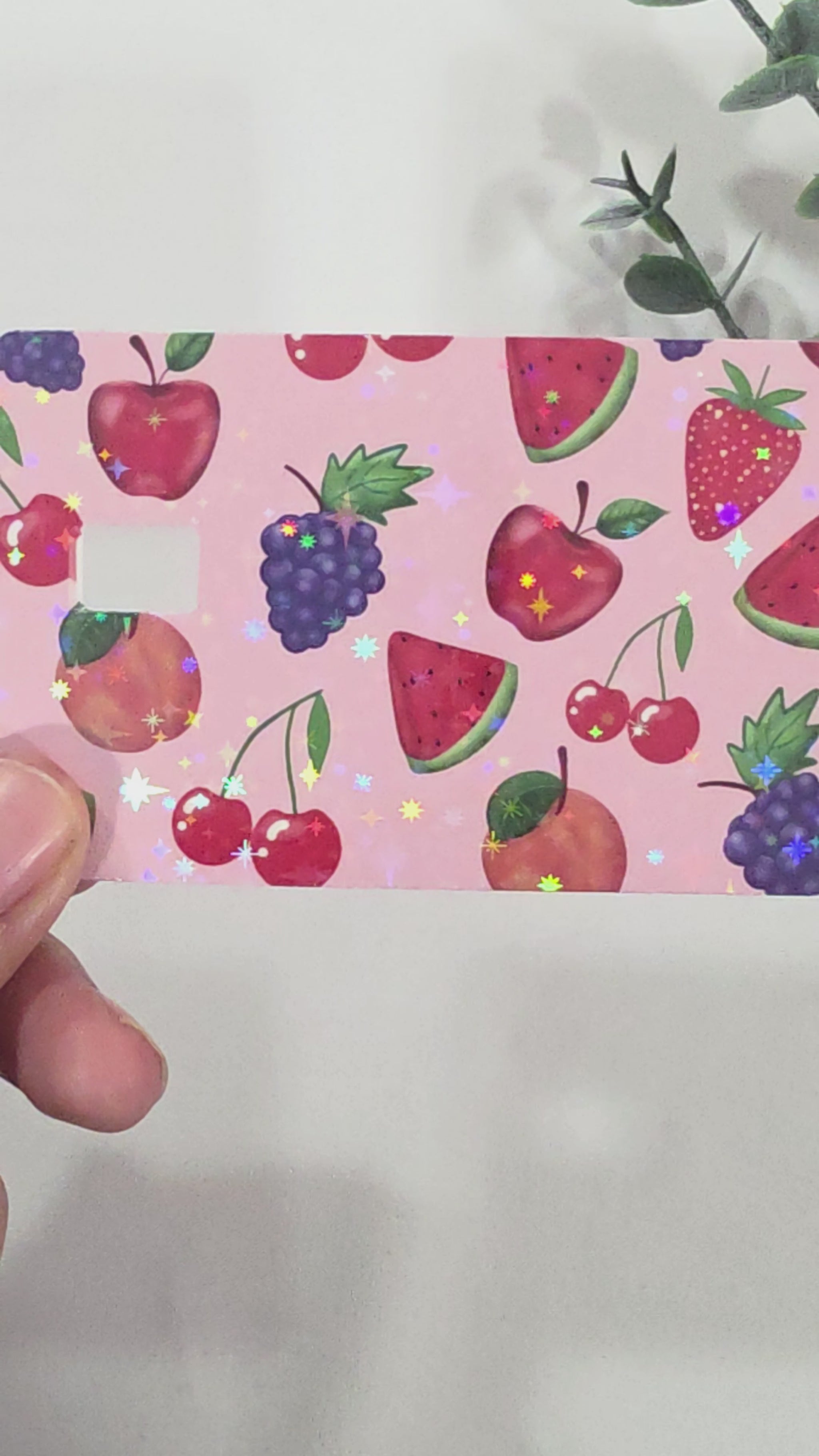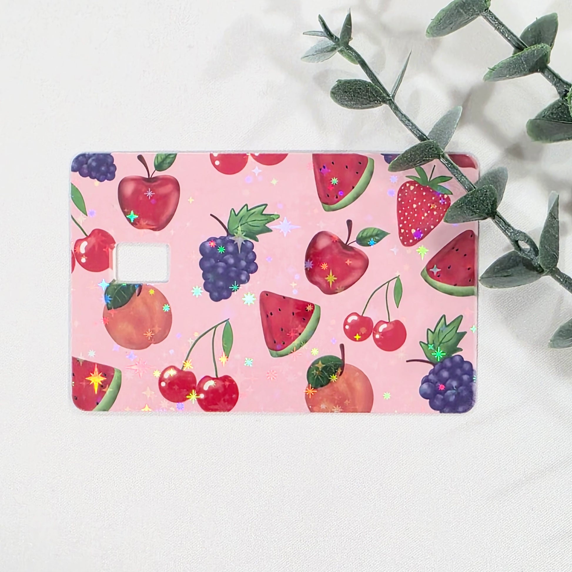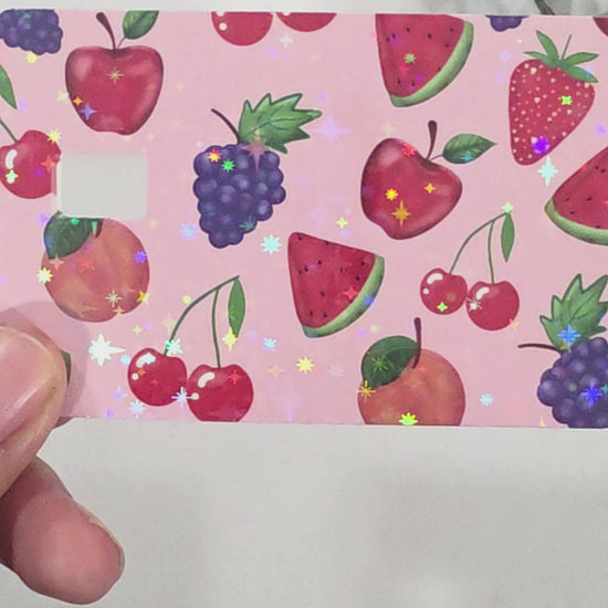 A fruit salad for your wallet! This holographic sparkle card skin features apples, grapes, watermelon, cherries, peaches, and strawberries on a soft pink background—sweet, colorful, and impossible to miss.