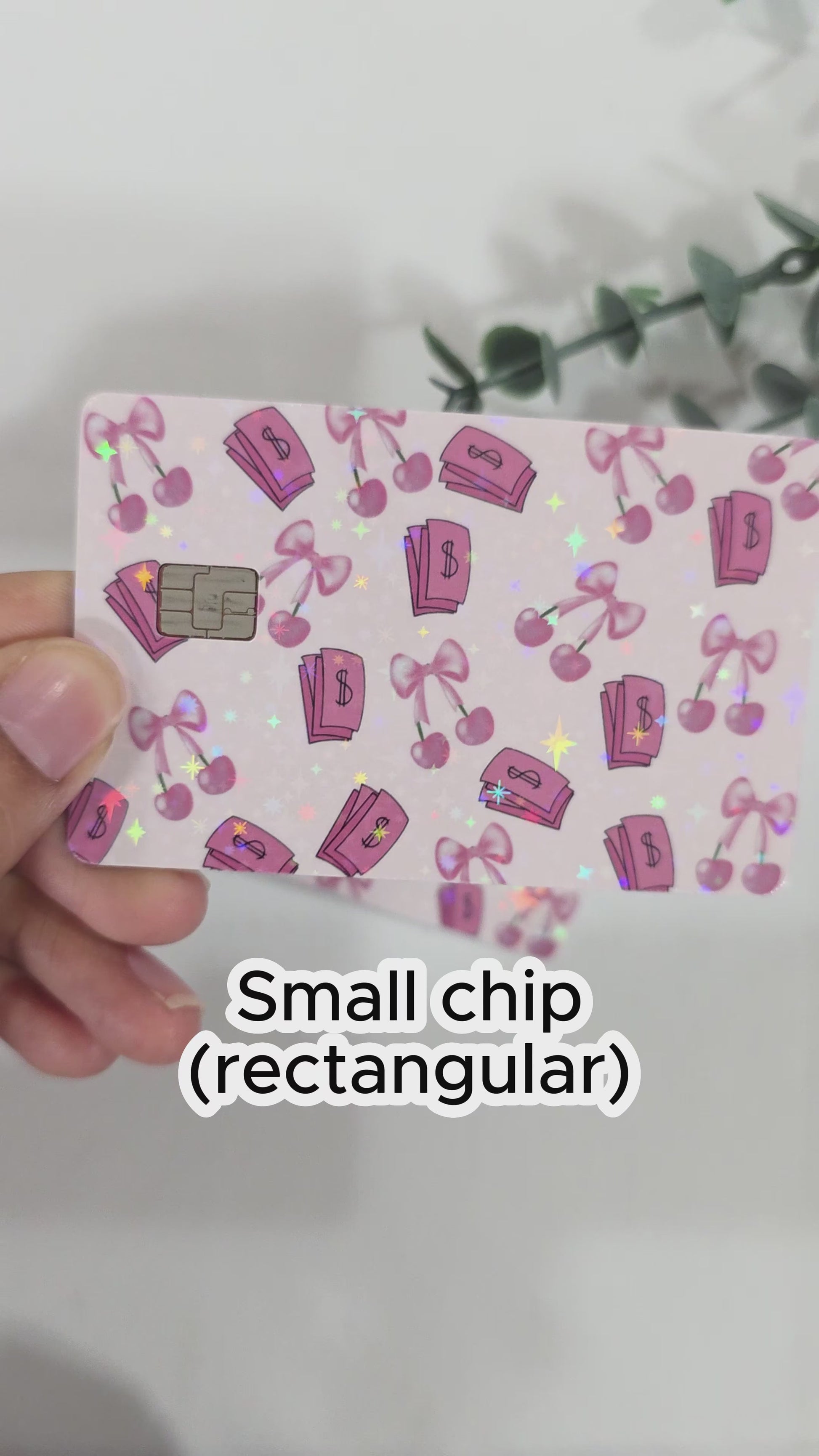 Add a little pink power to your everyday carry. This sparkle holographic credit card sticker features an all-pink palette with playful pink dollar bills and cherries topped with sweet pink bows. It’s bold, glossy, and unapologetically fun, because your wallet deserves a personality upgrade.