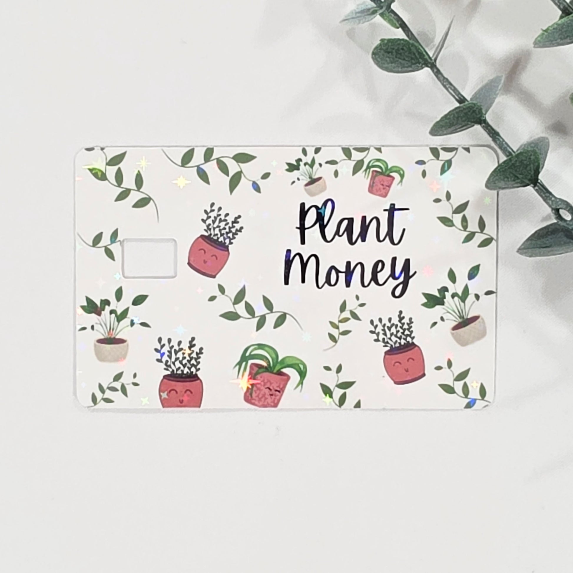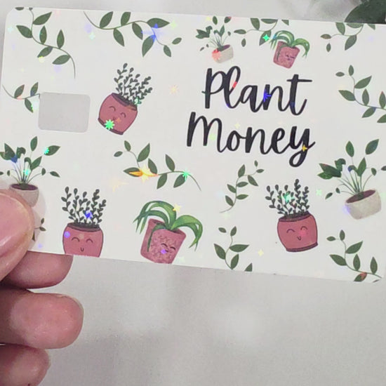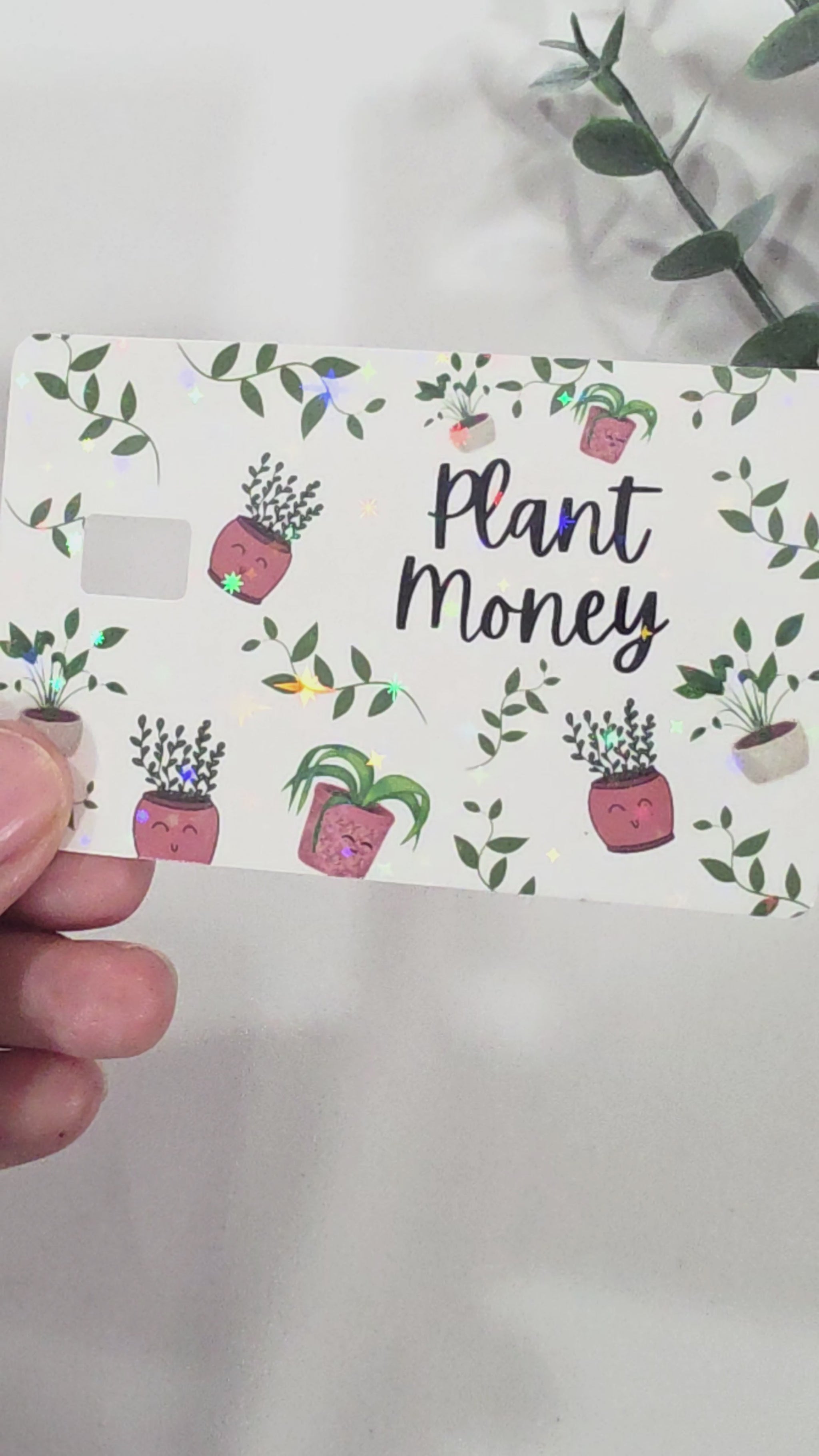 Grow your savings in style. This “Plant Money” holographic sparkle card skin features hand-drawn plants surrounding the phrase—perfect for plant lovers with a sense of humor.