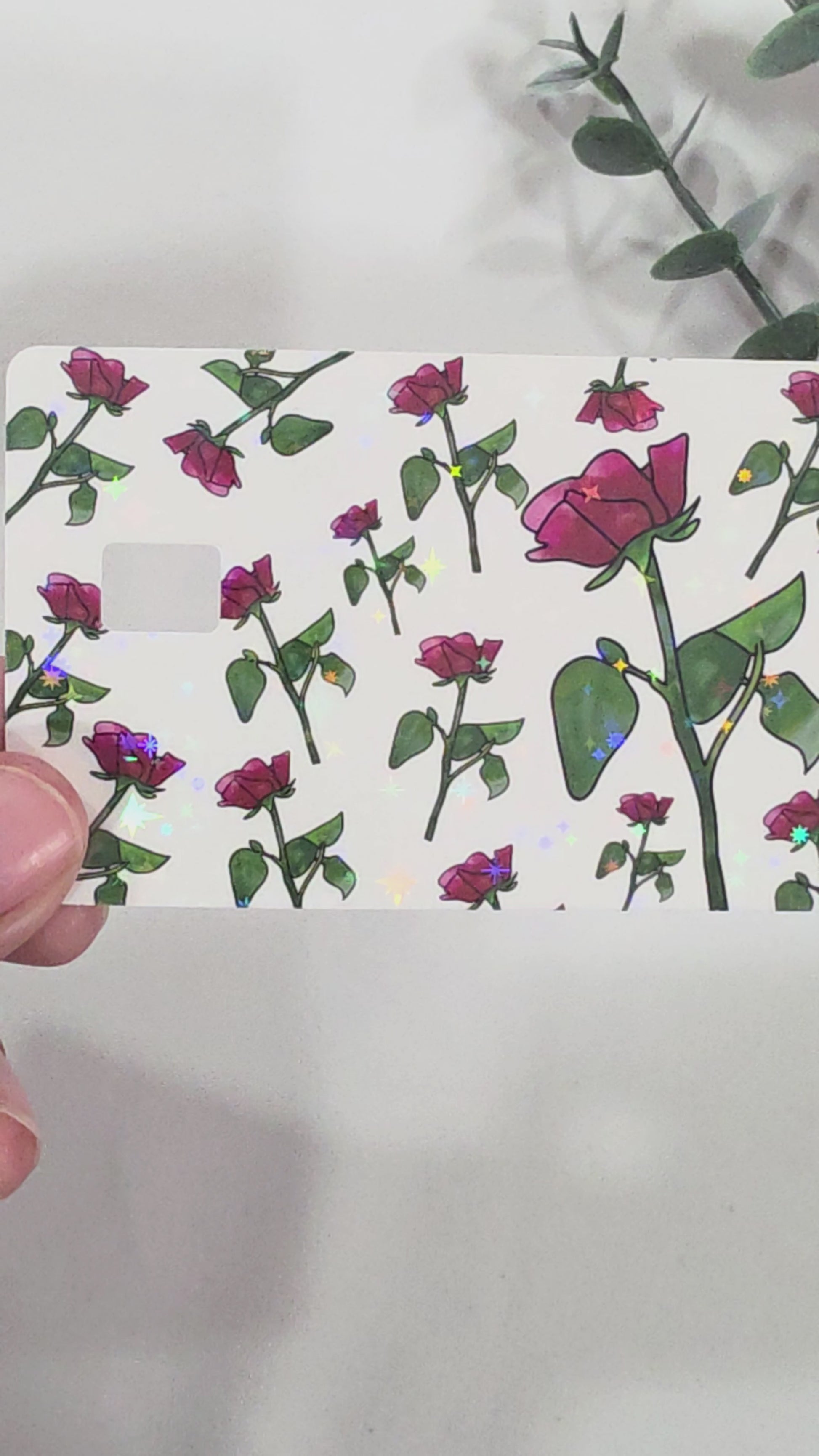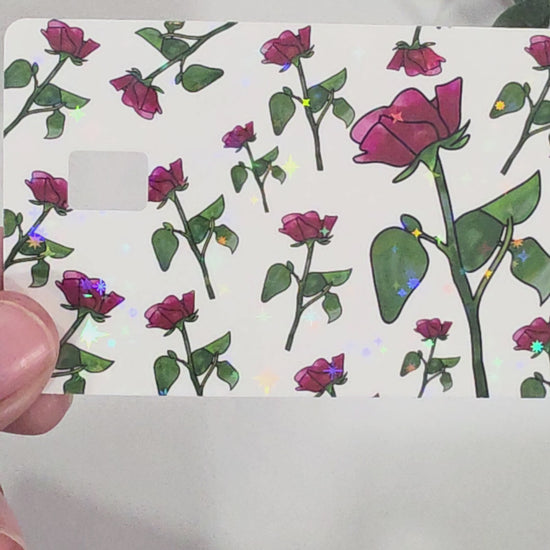 Romantic and classy with a holographic twist. This rose card skin features delicate hand-drawn flowers on a white background, topped with a sparkle holographic finish for subtle shimmer and charm.