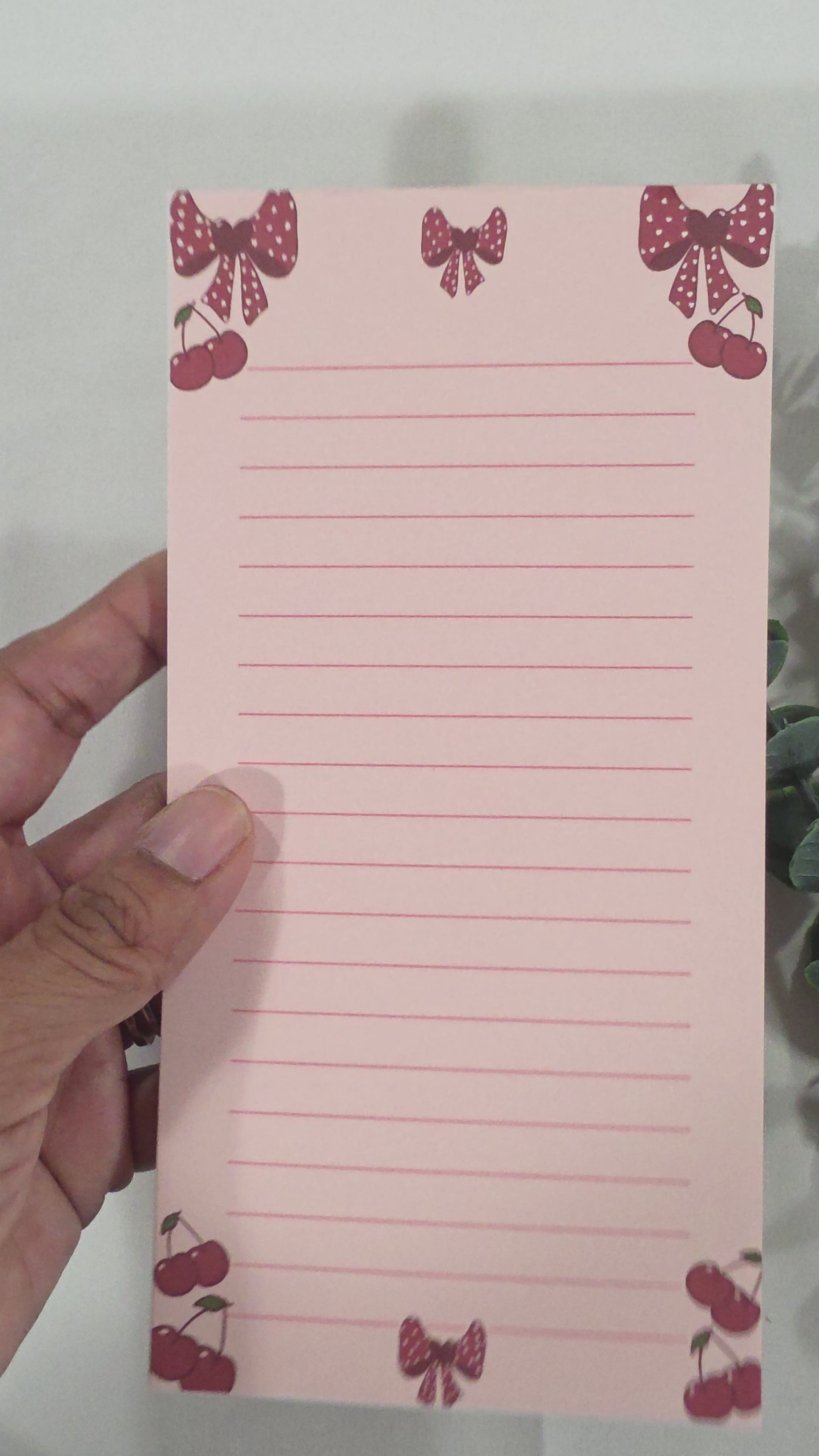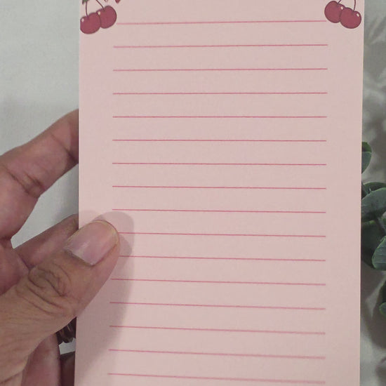 Bloc de notas con lazos rojos y cerezas