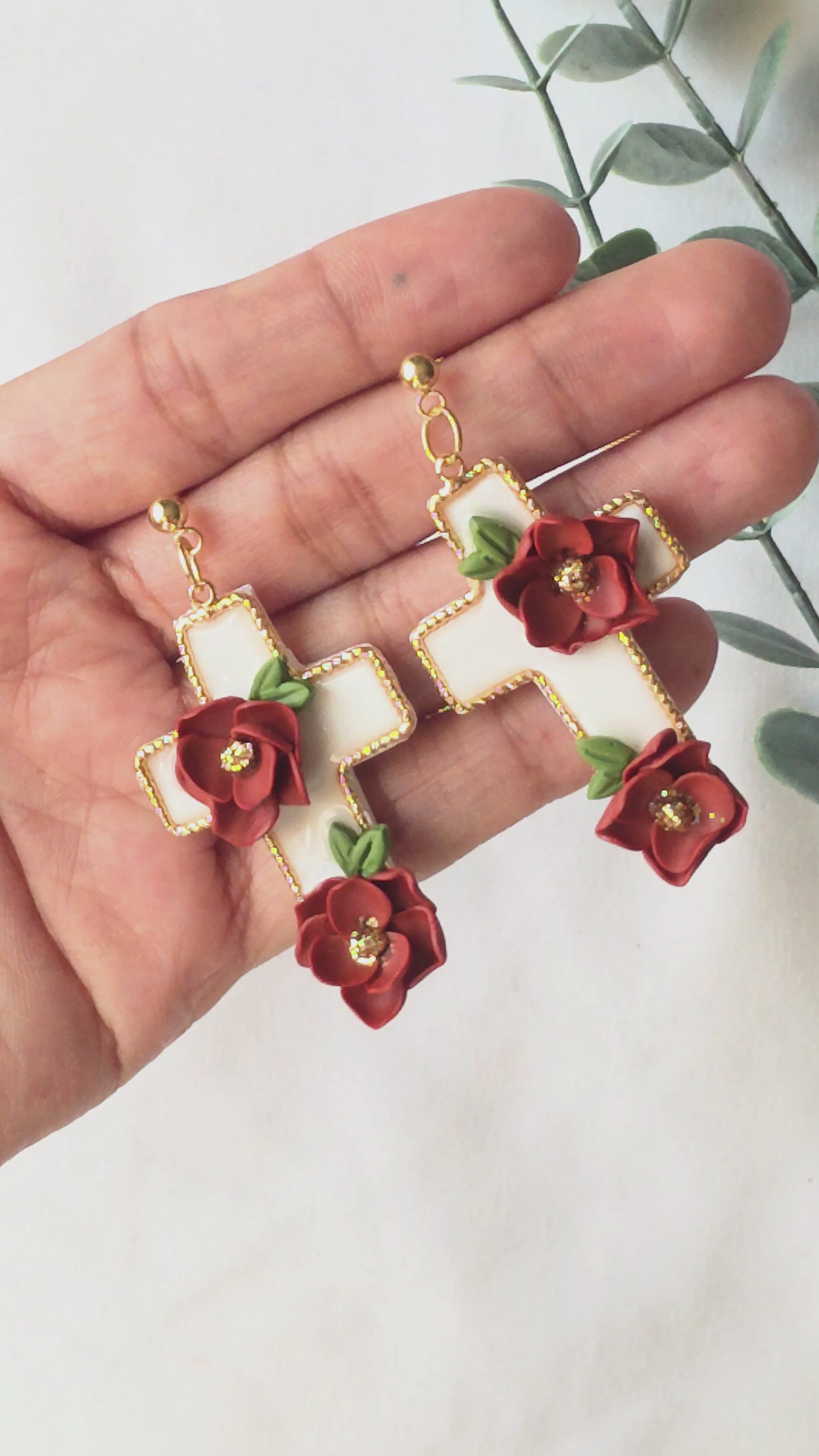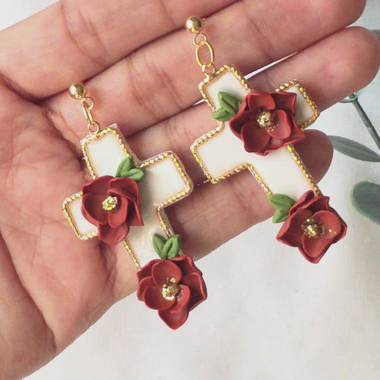 A timeless faith symbol reimagined with handcrafted detail. These floral cross earrings feature an off-white gold-plated brass cross adorned with sculpted red flowers and soft green leaves.