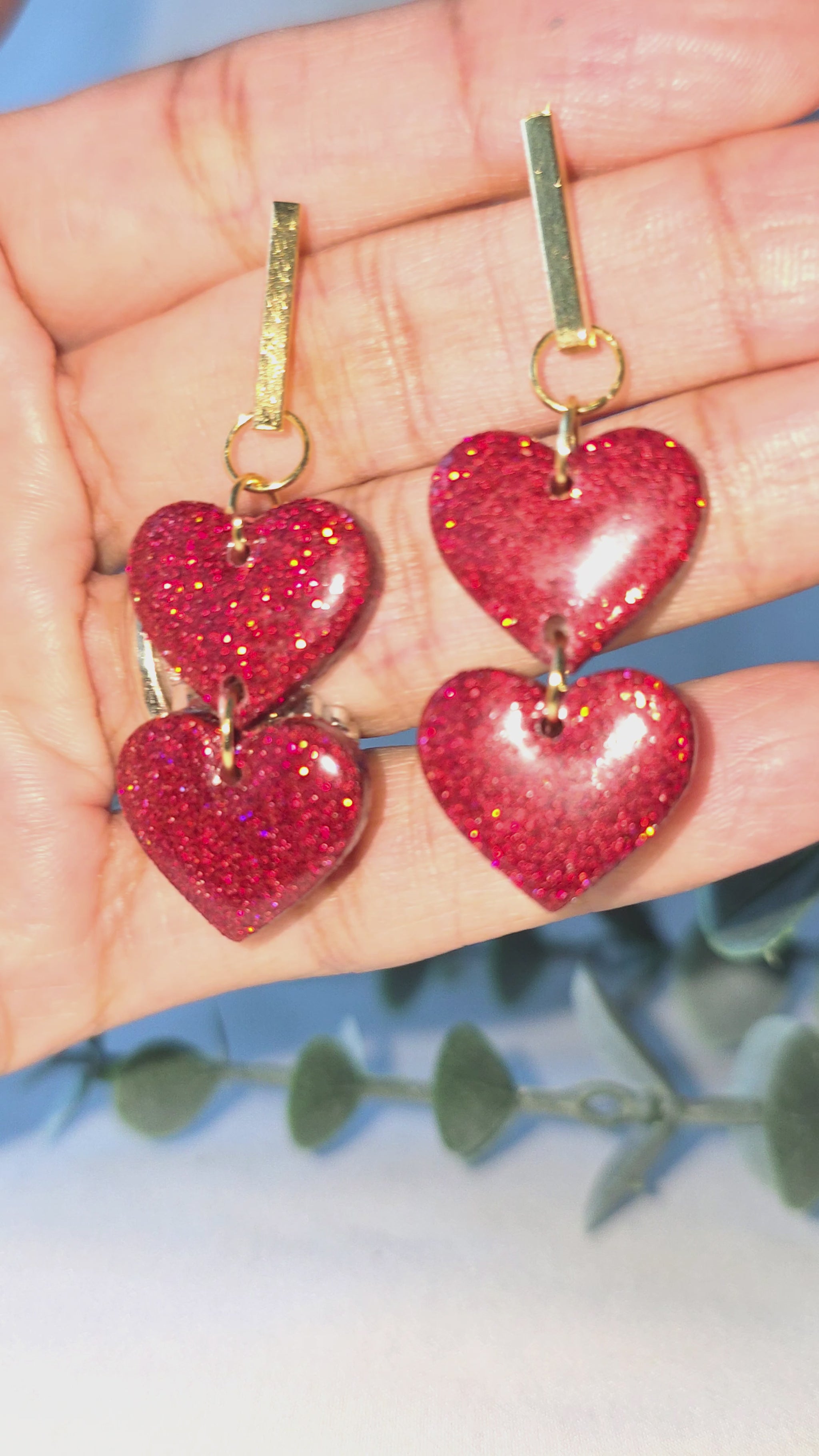 Meet your new go-to statement earrings for Valentine’s Day and beyond. These handmade gold or red glitter heart earrings are crafted from polymer clay and finished with a glossy UV resin topcoat for extra shine and durability. Lightweight, eye-catching, and unapologetically festive, they’re designed to sparkle without weighing you down.