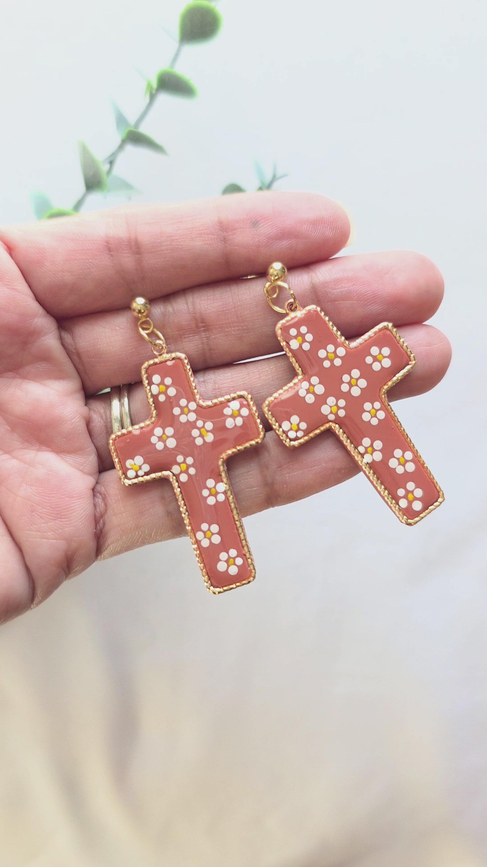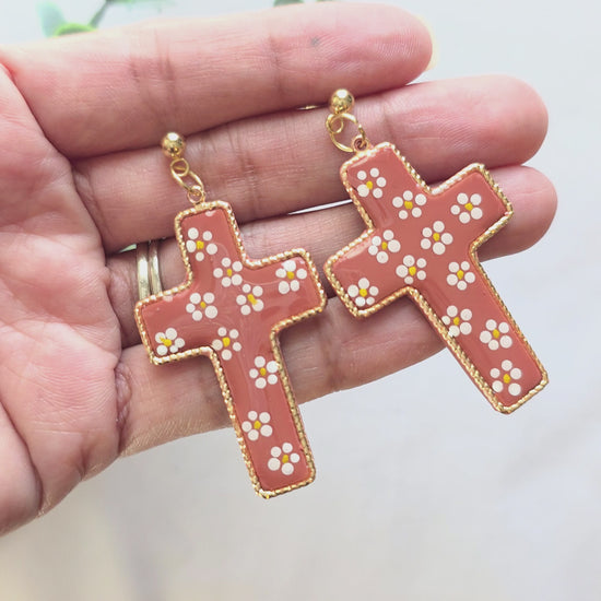 A statement with soul. These cross earrings are inspired by traditional Mexican pottery color palettes and hand-painted with delicate white floral details. Each cross features a polymer clay center, sealed with UV resin for lasting protection and shine, and finished with luxe gold-plated findings.