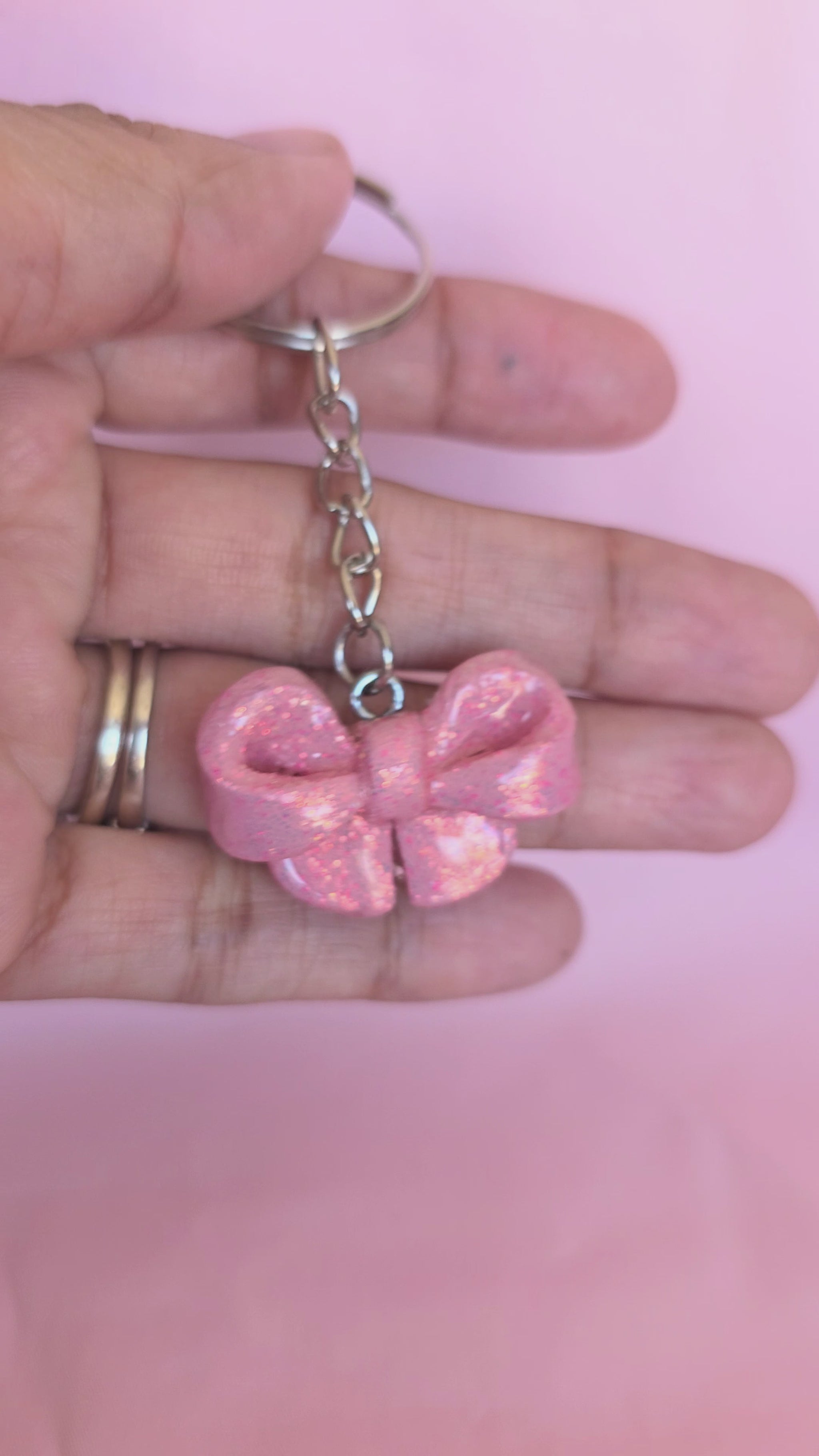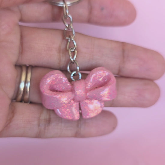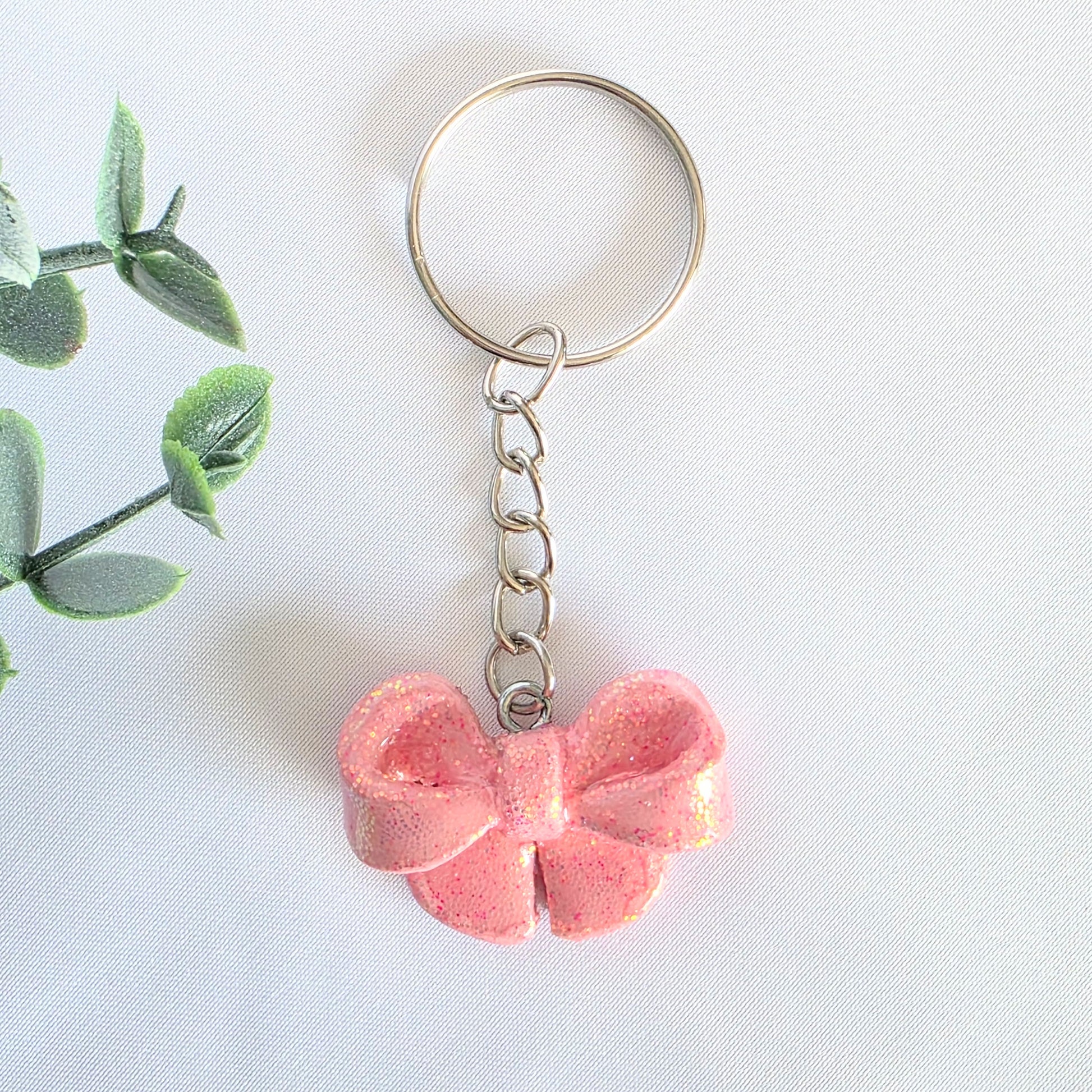 Add a sprinkle of sweet sparkle to your keys or bag with this handcrafted baby pink glitter bow keychain. Made from lightweight polymer clay and coated in a shiny UV resin glaze, this charm is full of charm and durability. Measuring about 3 inches from top to bottom (including the keyring), the bow itself is approximately 1.5 inches wide and 1 inch tall. Whether you're accessorizing your purse or gifting a friend something cute and unique, this tiny bow makes a big impression.