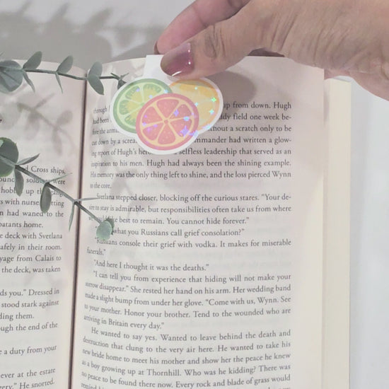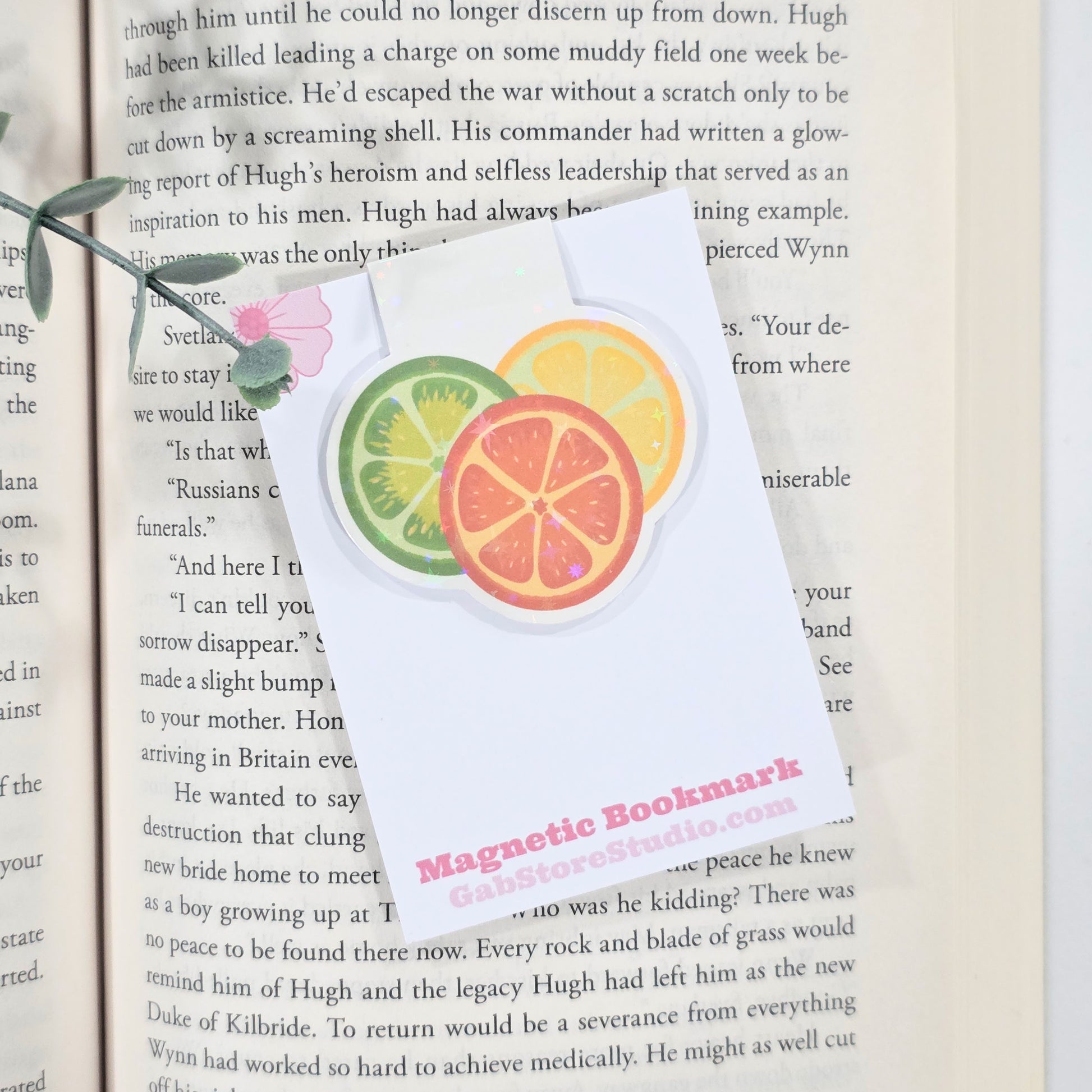 Freshen up your reading with this citrus slice magnetic bookmark! Measuring about 2" x 2", it features lemon, orange, and lime wedges in a hand-drawn fruit design. Laminated with sparkle holographic film, this bookmark shines while keeping your place secure.