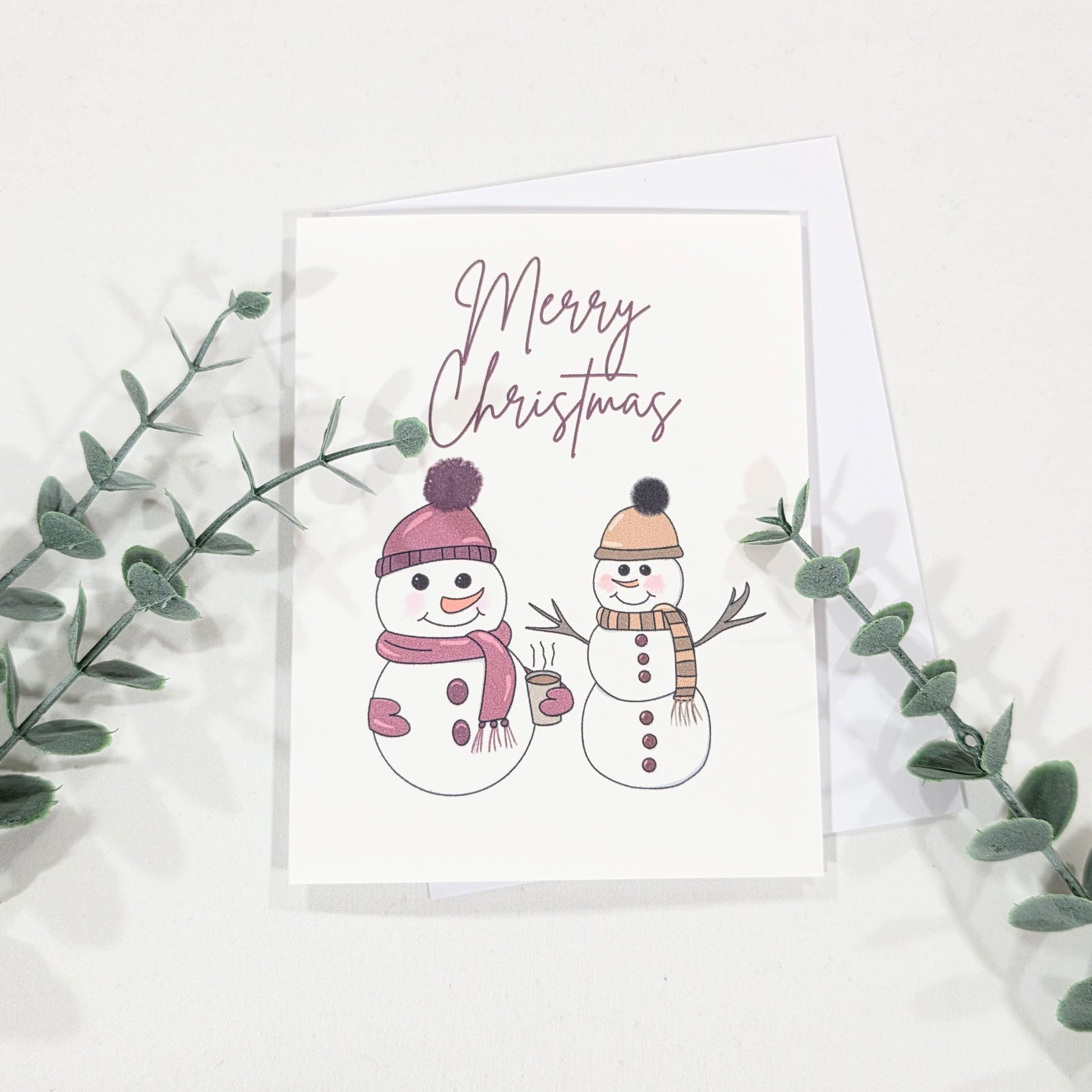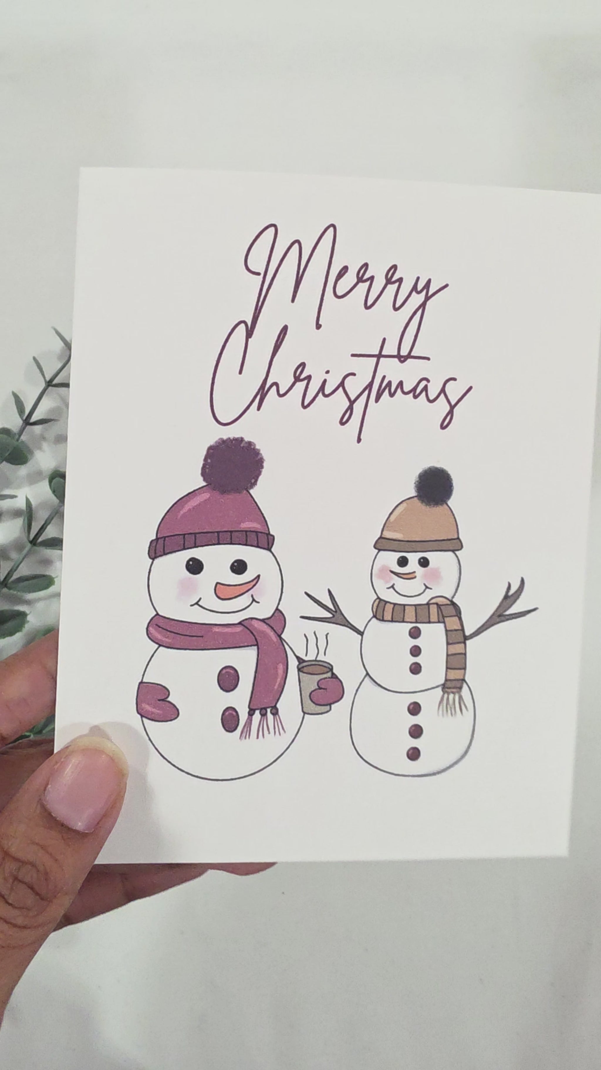 Bring cozy cheer to someone’s mailbox with this handmade Christmas card featuring my two popular snowmen, one with a tan and brown scarf, the other in burgundy mittens and hat, sipping cocoa. A festive favorite that captures the magic of winter.