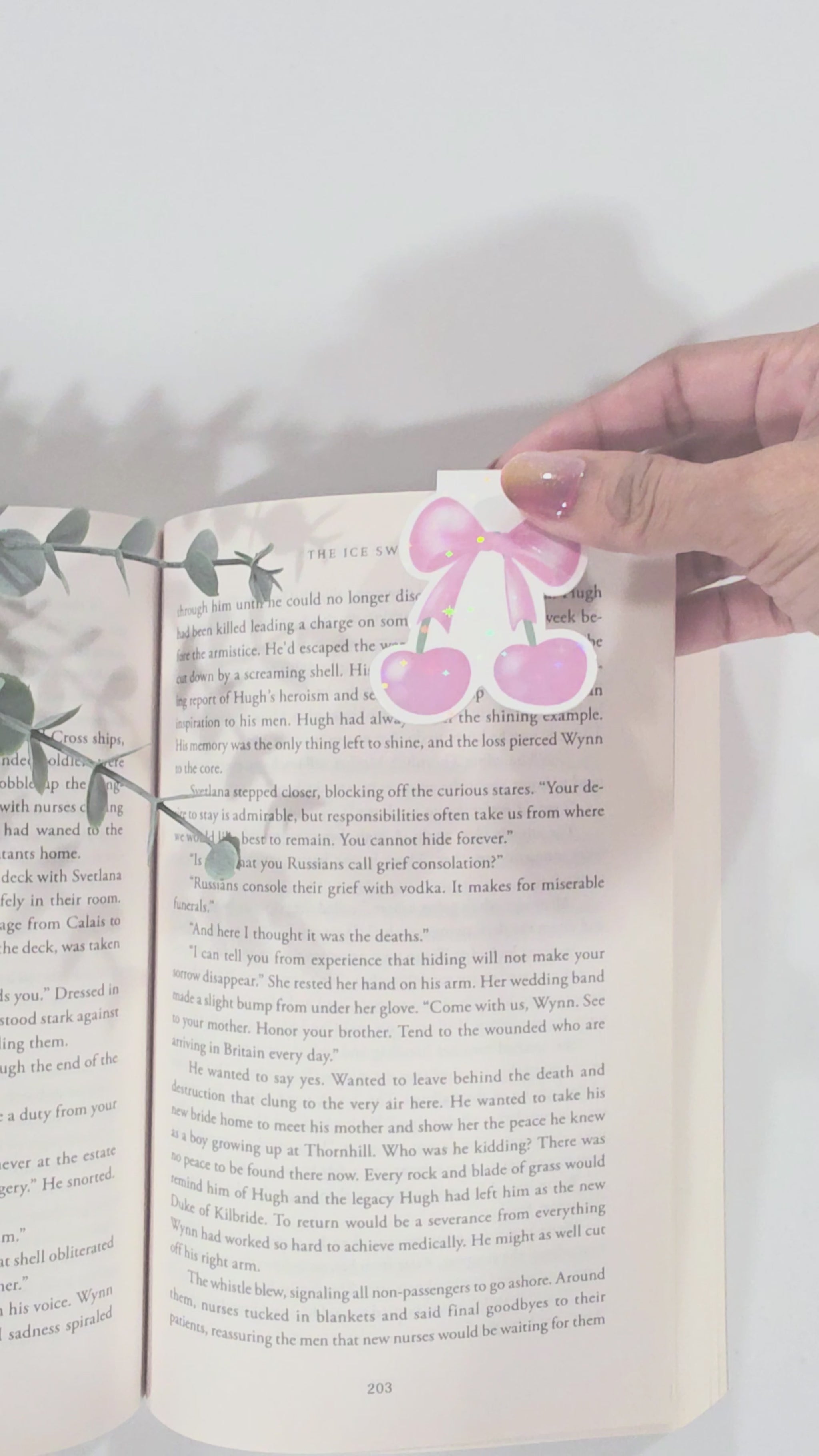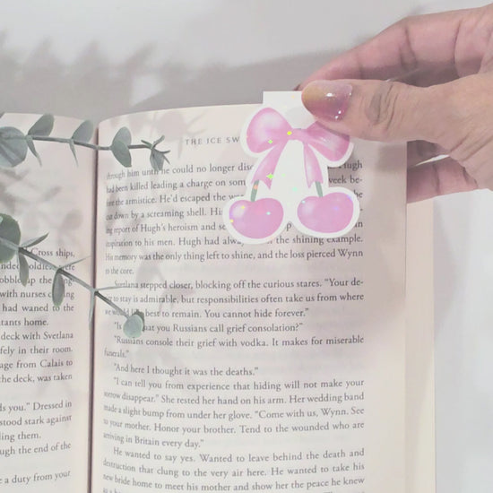 Add a sweet touch to your reading with this pink cherries magnetic bookmark! Featuring a cute cherry pair topped with a bow, this 2.5" x 2" handmade bookmark is laminated with a sparkle holographic finish that catches the light beautifully.
