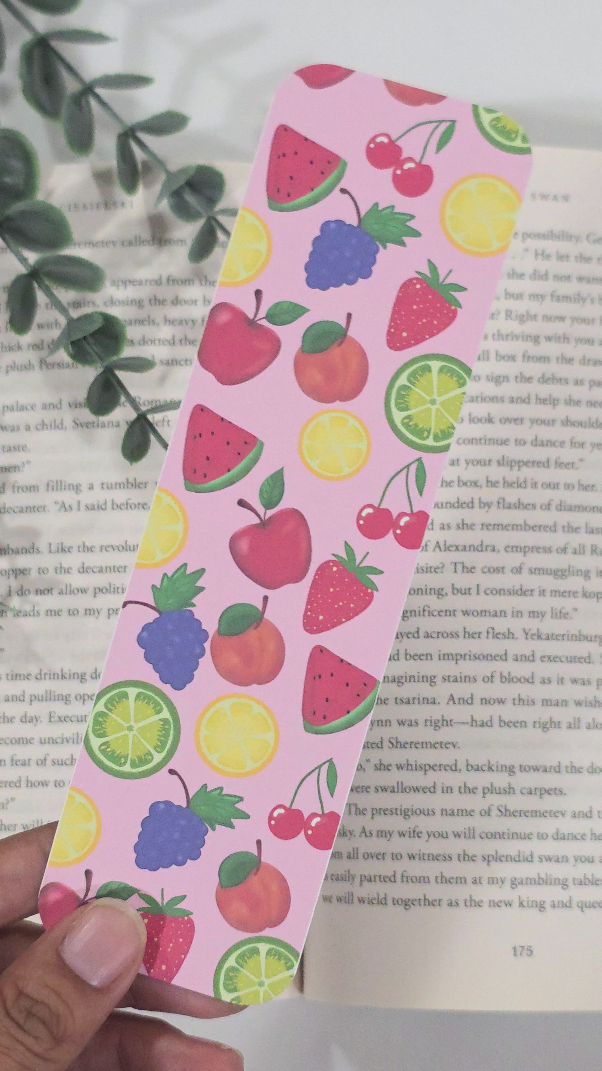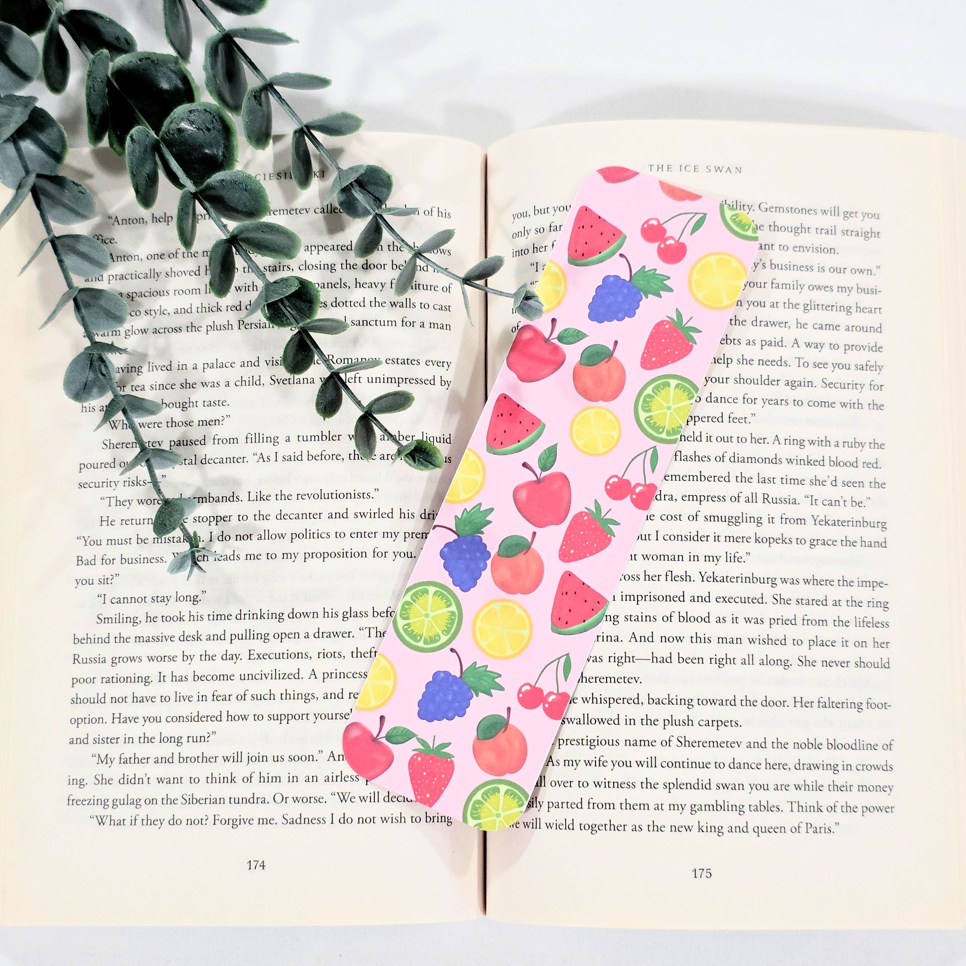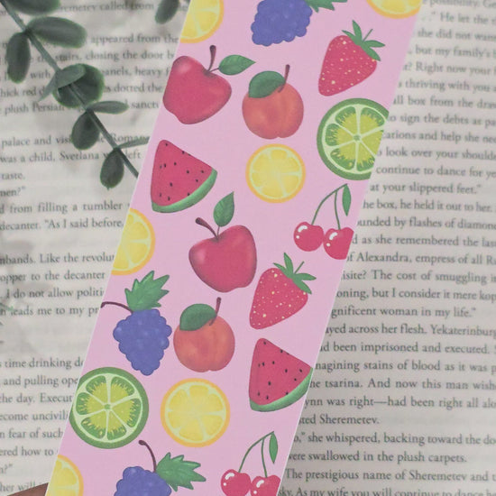 A sweet pop of fruit to brighten your reading! This handmade bookmark features apples, peaches, lemons, limes, strawberries, cherries, and grapes scattered on a light pink background. Printed on sturdy cardstock and carefully hand-cut, it’s a fresh twist on everyday reading accessories.