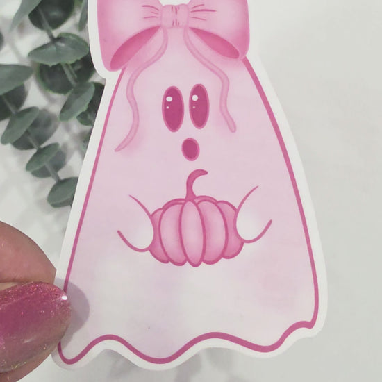 Get into the fall spirit with this Pink Ghost Girl with Pumpkin Sticker! This pastel ghost, complete with a bow and a little pumpkin, is spooky-cute and perfect for Halloween decorating. Glossy, water resistant, and approximately 3 inches on the longest side, it’s a fun way to add pink fall charm to your laptop, planner, or tumbler.