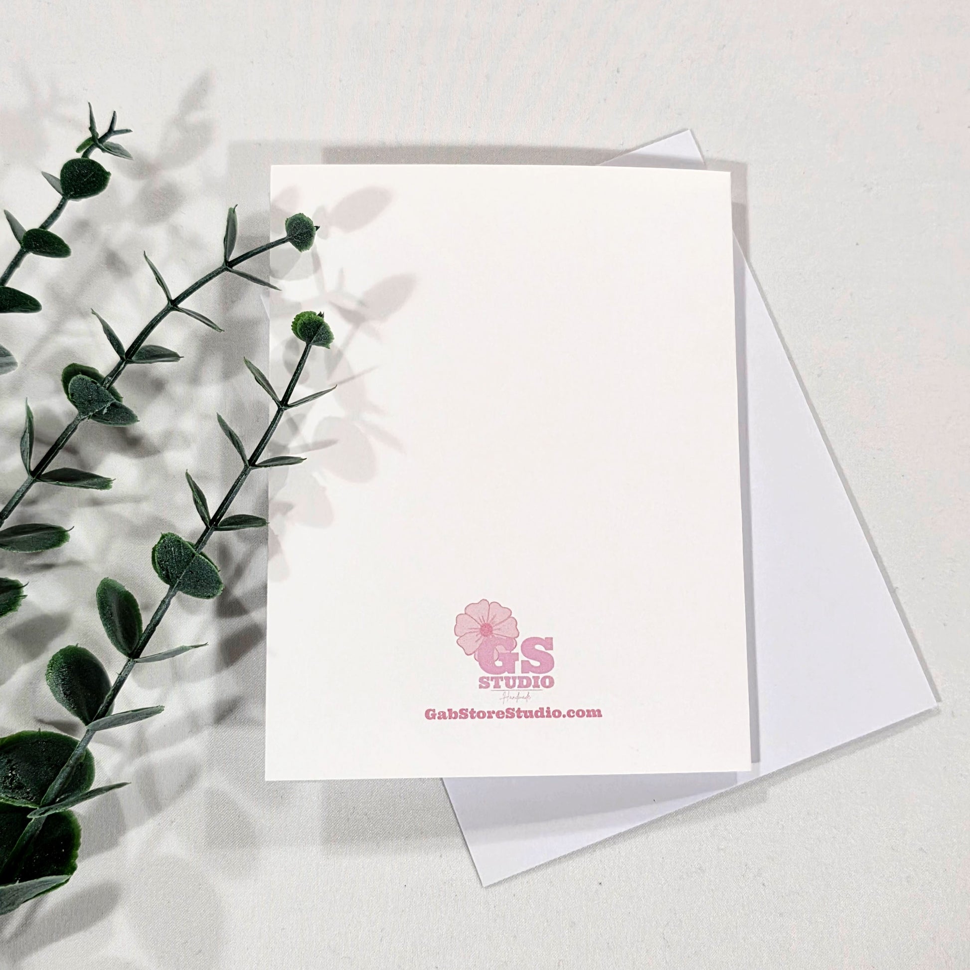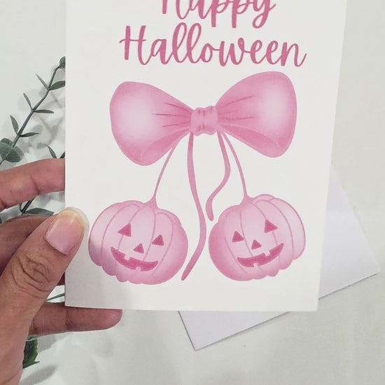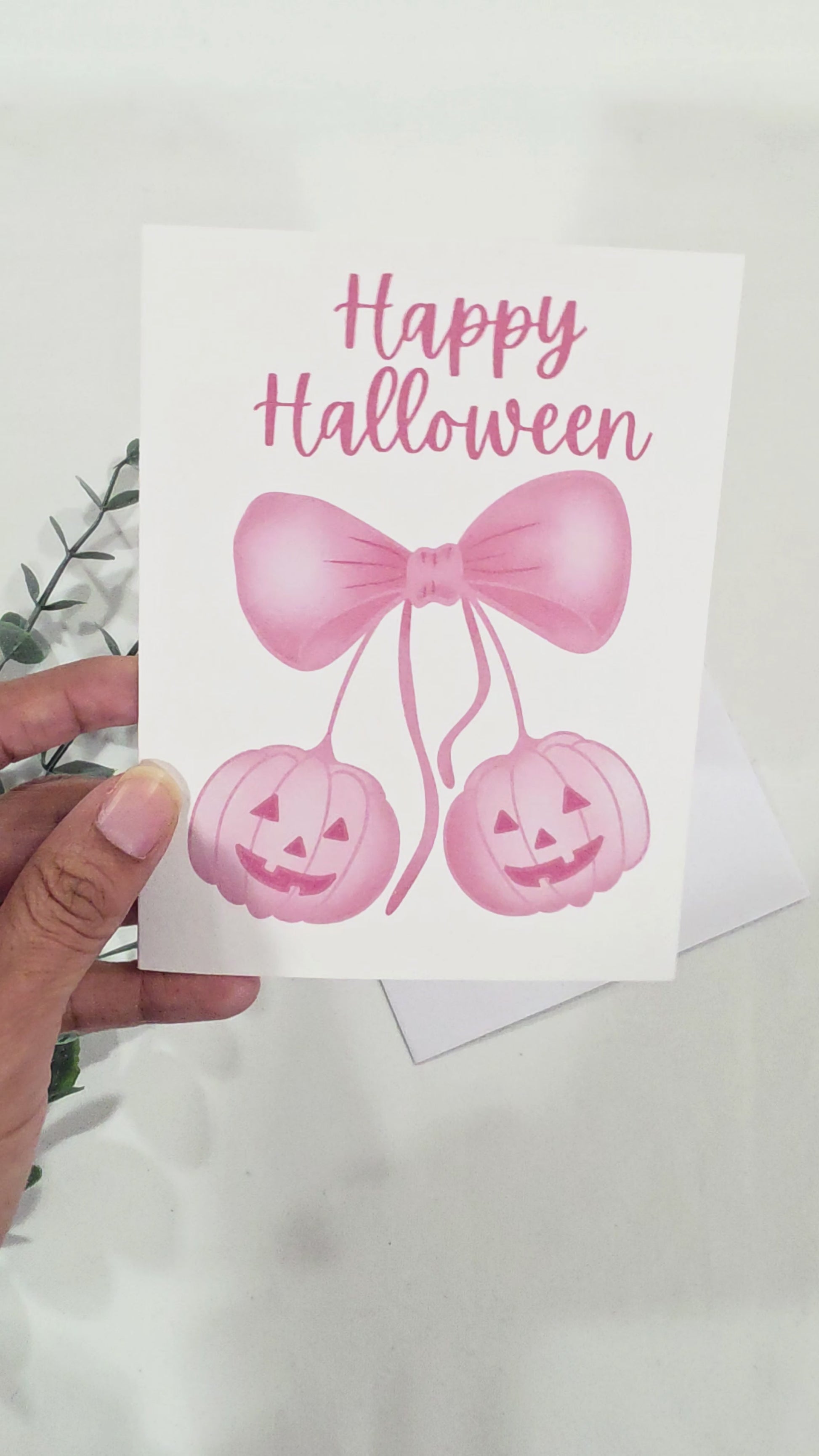 A sweet twist on spooky. This handmade Halloween card adds a dash of charm to the season with pink pumpkins tied in dainty bows and a playful “Happy Halloween” design, all from my original artwork.