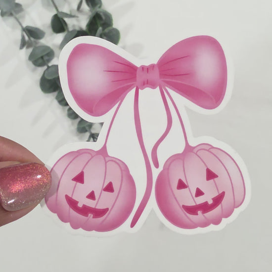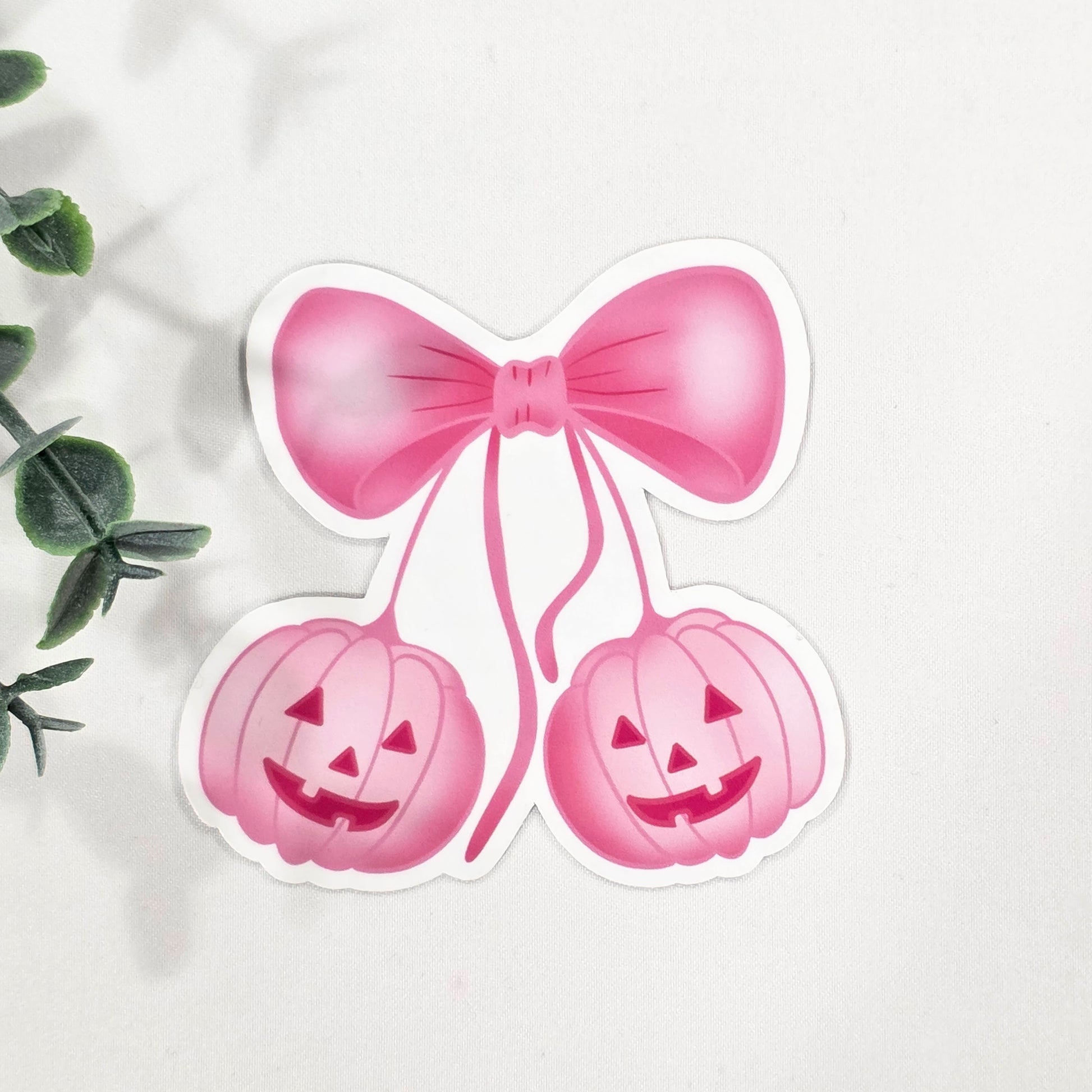 A playful blend of fall and Halloween! This Pink Pumpkin Cherries Sticker features two pumpkins tied with bows, styled to look like cherries. At 2.75 inches, this glossy, water resistant sticker is great for laptops, planners, and seasonal decorating.