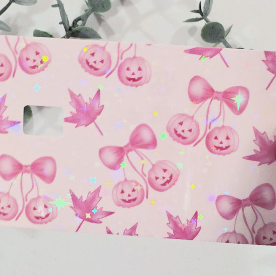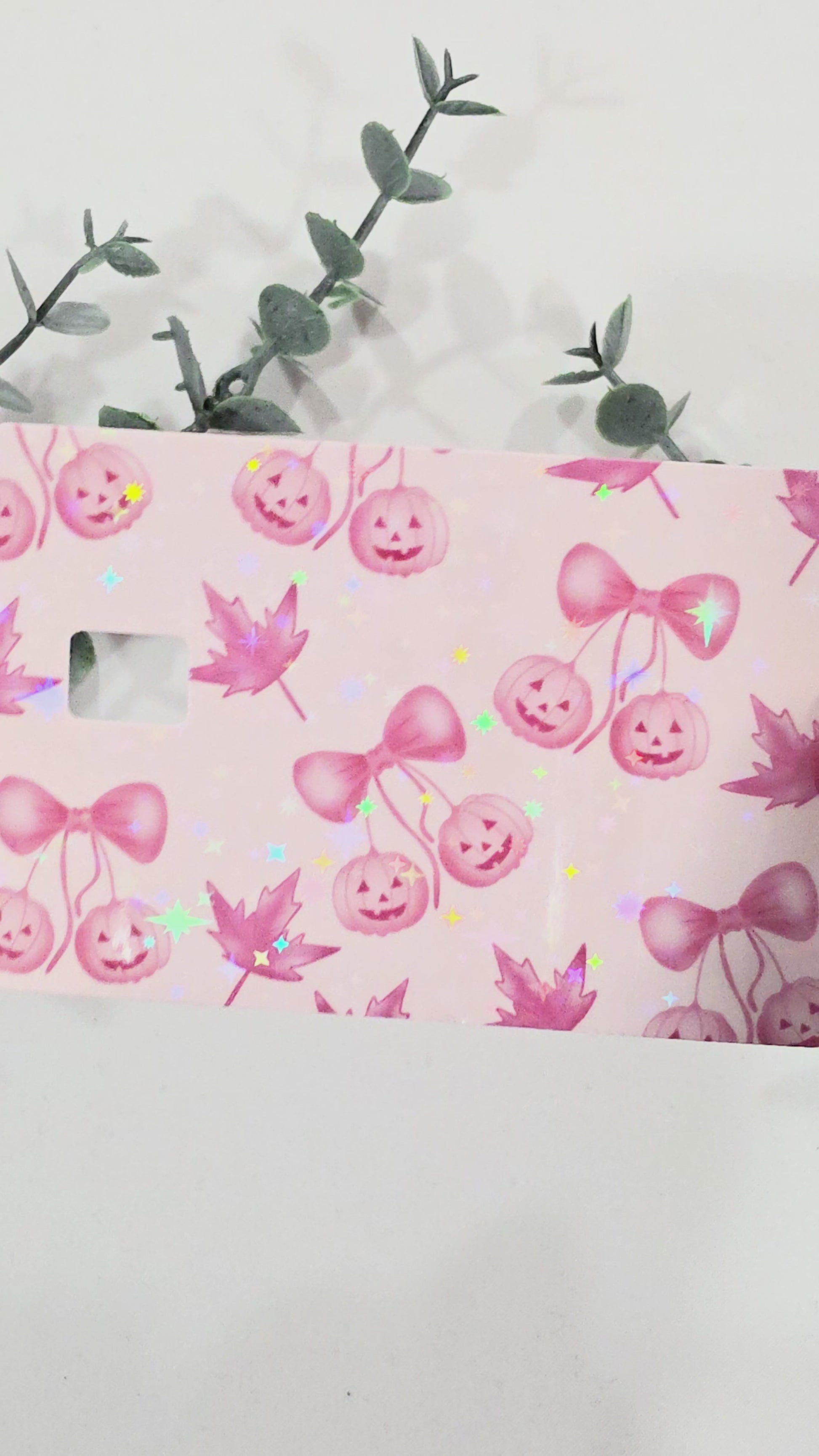 Pretty meets spooky. This pink pumpkin card skin brings Halloween vibes with a feminine twist, hand-drawn pumpkins tied with bows on a soft pink background.