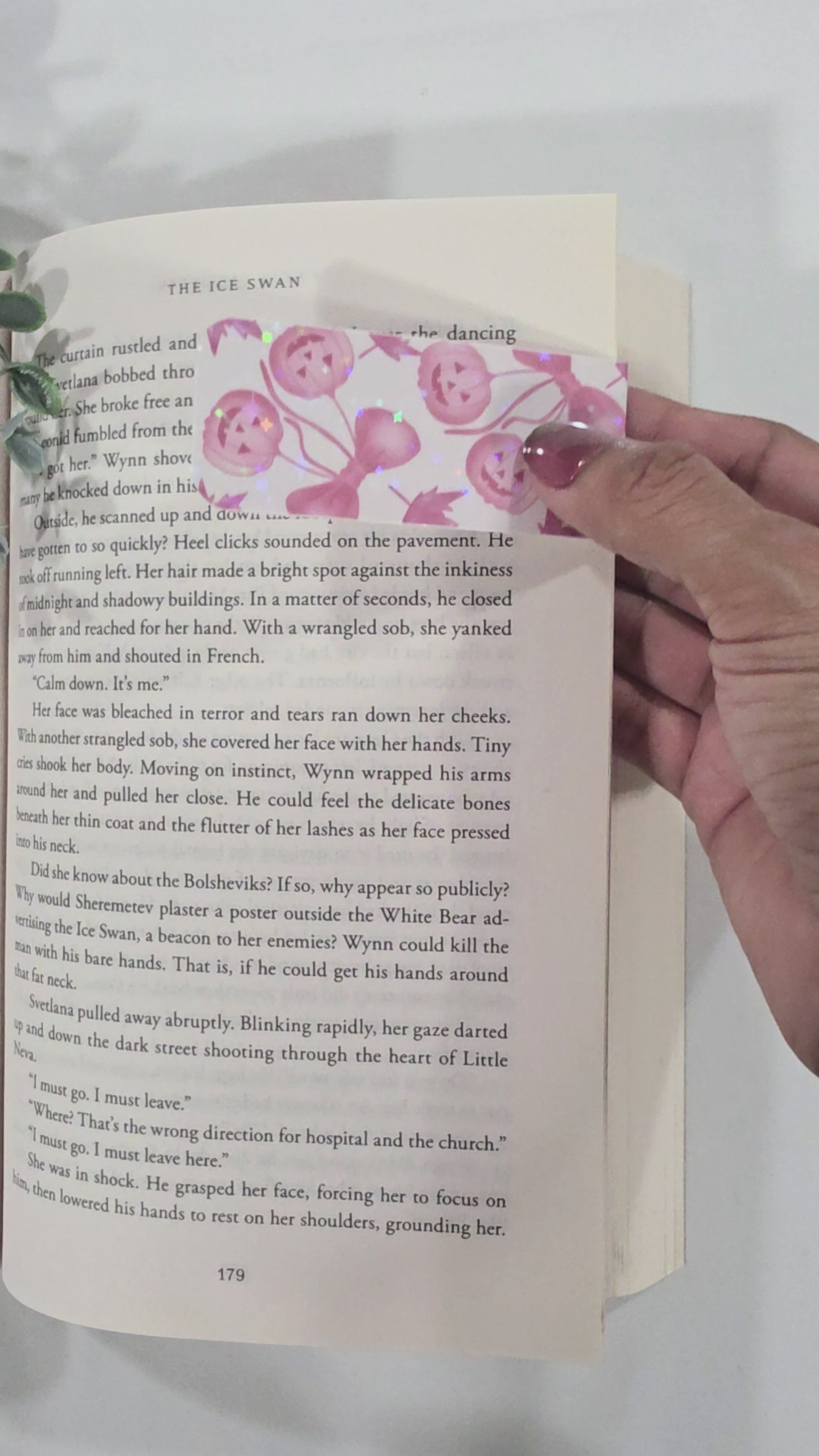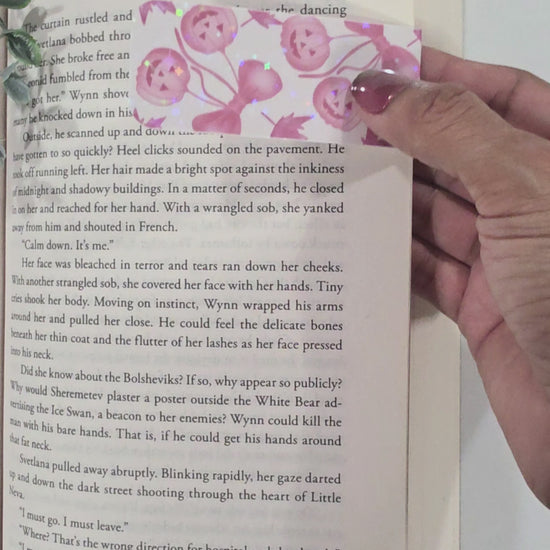 Celebrate fall and Halloween with a pastel touch! This handmade magnetic bookmark features pink pumpkins tied with bows and surrounded by falling leaves. Laminated with holographic sparkle, it shines beautifully while strong magnets hold multiple pages or even soft covers. Rounded corners make it smooth and easy to use.