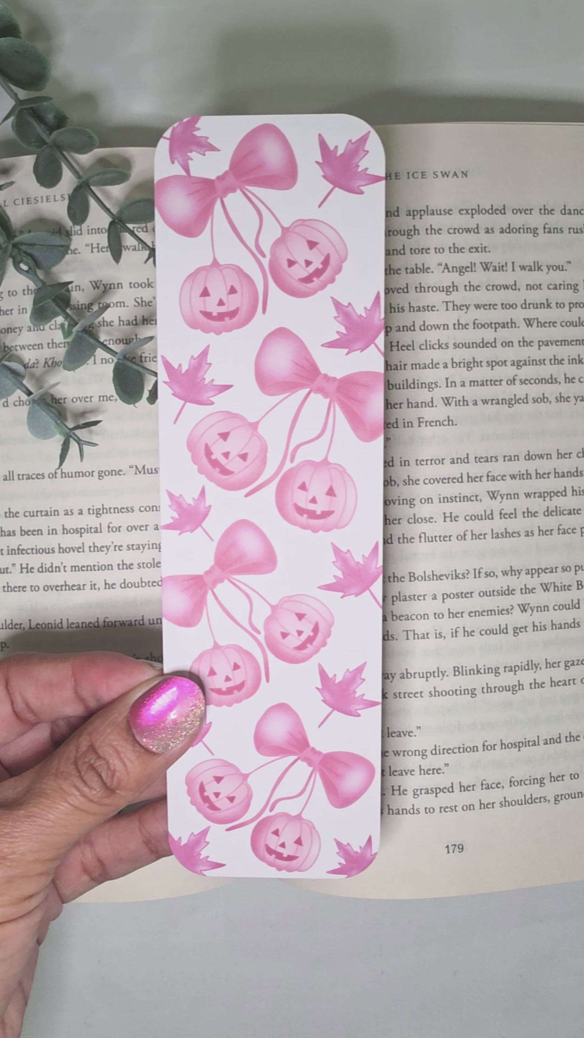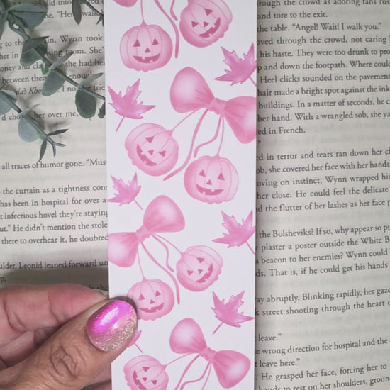 Add a pastel twist to your reading with this pink pumpkin and bow bookmark. Designed with hand-drawn pumpkins tied with bows and scattered falling leaves, it captures both the cozy spirit of fall and the playfulness of Halloween. Printed on thick 120lb cover cardstock, each bookmark is carefully hand cut and finished with rounded corners in my studio.